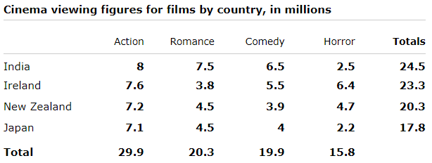 The table below shows the cinema viewing figures for films by country, in millions.
